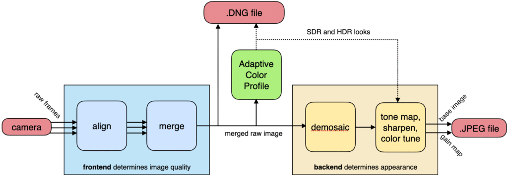 A simplified depiction of Indigo’s image processing pipeline. The frontend (at left) aligns and merges a stream of raw frames flowing from the camera. The merged but still (nearly) raw image is optionally stored as an Adobe DNG (Digital Negative) file (red box at top). The look computed by our Adaptive Color Profile AI (green box) is stored in the DNG file alongside the pixels, but doesn’t change them. The output of this AI also drives the backend (at right), which consists of tone mapping, sharpening, and color adjustments. These operations do change the pixel values. The modified pixels are compressed and stored in the JPEG file. The baking of adjustments into pixels is why editing a JPEG is always harder than editing a DNG.